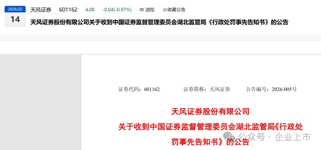 2026 年 2 月 13 日,公司收到中国证监会湖北监管局下发的《行政处罚预先示知书》(鄂处罚字[2026] 7 号),原文内容如下: