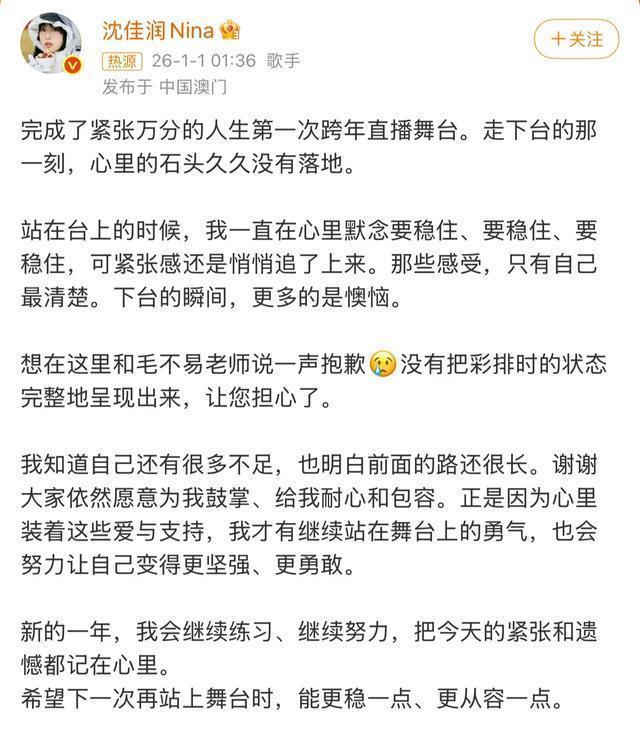 更动发生在2025年跨年夜,江苏卫视直播中,沈佳润与毛不易齐唱《不染》时情景百出:启齿抢拍、全程跑调,高音部分频频破音,毛不易全程轻声帮腔、减速节拍也没能补助场面。