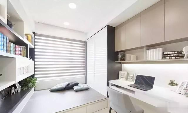 即是蓝本只可塞下一张床和一个柜子的空间,目下不仅有了床和柜子,还多出来一个竣工的学习区和强大的储物空间。
