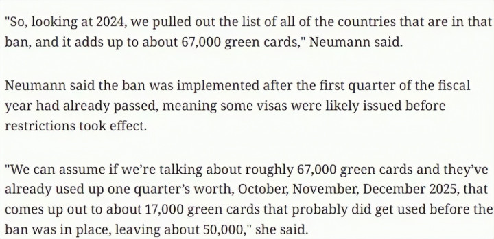 由于完结顺序在2026财年第一季度(2025年10月至12月)完结后才全面落地,该季度已浮滥了约1.7万张配额。据此估算,若禁令在2026财年剩余期间内抓续成效,将留住约5万张未使用的支属侨民绿卡。