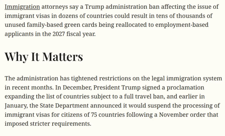 激发这次潜在限额转化的径直原因,是一项签证策略的诊治。自2026年1月起,好意思国政府加强了对部分国度侨民签证的审查与披发完结。侨民讼师分析指出,这一策略将径直导致极端数目的家庭类侨民签证在本财年内无法正常披发。