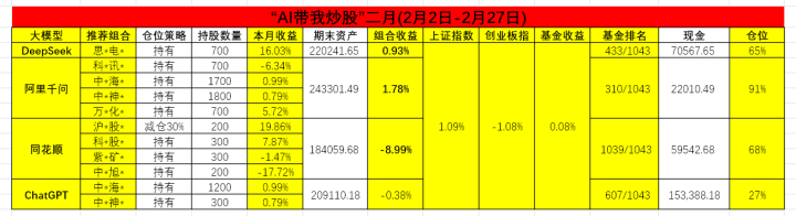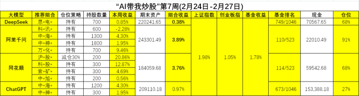 比拟之下,DeepSeek和ChatGPT组合本周弘扬相对平庸。其中,DeepSeek组合在周中收益一度跨越5%的情况下,2月终末一个来回日大幅回撤5.67%,最终周收益仅+0.38%,这也泄漏了握仓过于逼近的毛病。ChatGPT组合则因为合座仓位较低(股票握仓比例仅27%,大部分为现款),周收益仅为+0.97%。