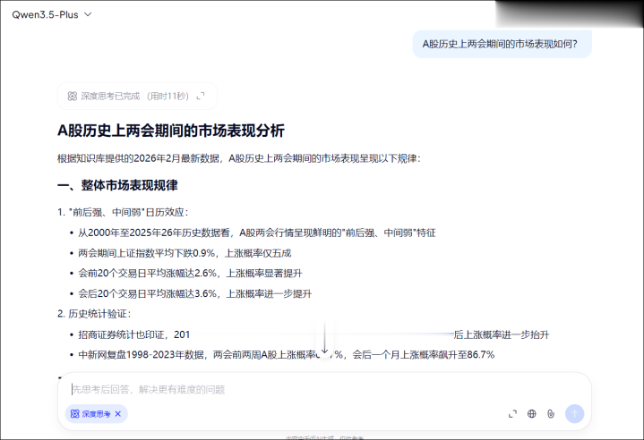 对此,咱们向当今四大AI模子中保握当先的阿里千问相关了干系两会技巧的市集契机和挑战,对此,阿里千问恢复说念,“从2000年至2025年26年历史数据看,A股两会行情呈现赫然的‘前后强、中间弱’特征,两会技巧上证指数平均下落0.9%,飞腾概率仅五成,会前20个来回日平均涨幅达2.6%,飞腾概率显赫提高,会后20个来回日平均涨幅达3.6%,飞腾概率进一步提高。”