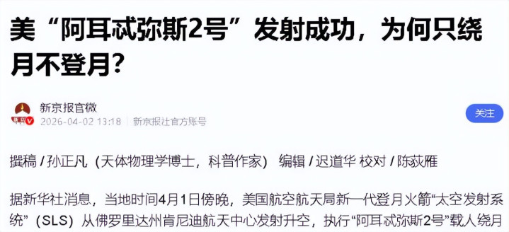 阿波罗谋略能让宇航员踏上月球、插旗、挖土,而此次阿尔忒弥斯Ⅱ号任务,连登月舱齐莫得,宇航员只可在距离月面约6544公里的场所飞掠,连月球的外相齐碰不到,说是绕月,其实即是在月球隔邻“兜了一圈”。