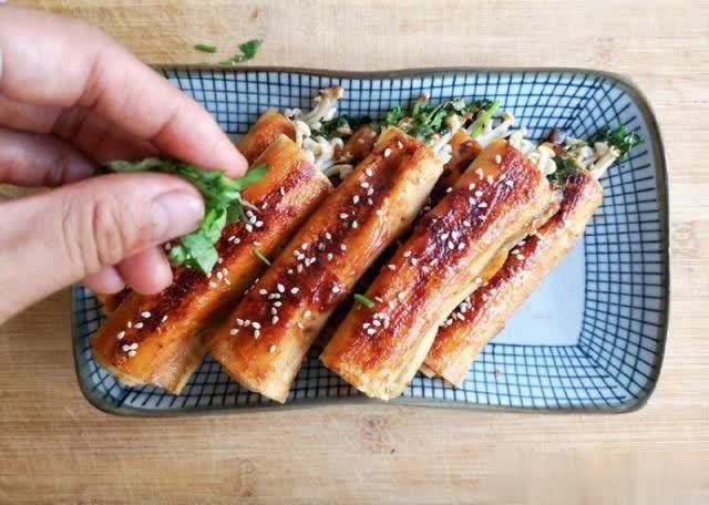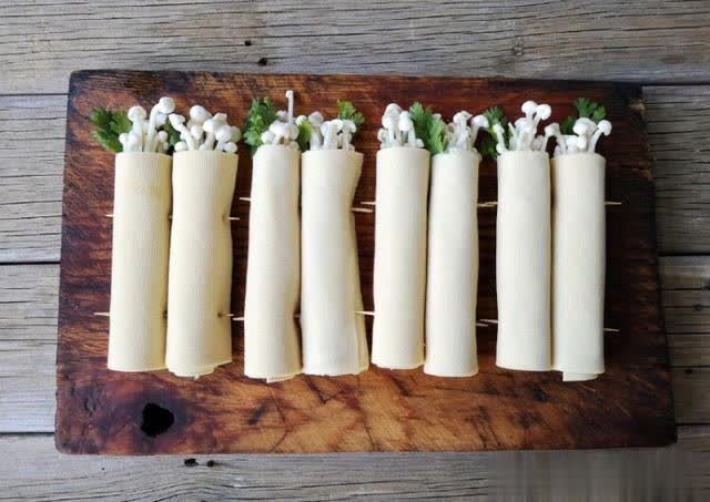 6、将准备好的金针菇香菜,胡萝卜丝放在干豆腐里,卷成卷,卷的本领尽量卷的巩固一些,以免煎的本领松散开。影响好意思不雅。