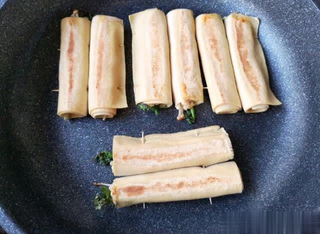 8、将卷好的干豆腐放在锅中,煎炒至两面金黄,干豆腐变软。