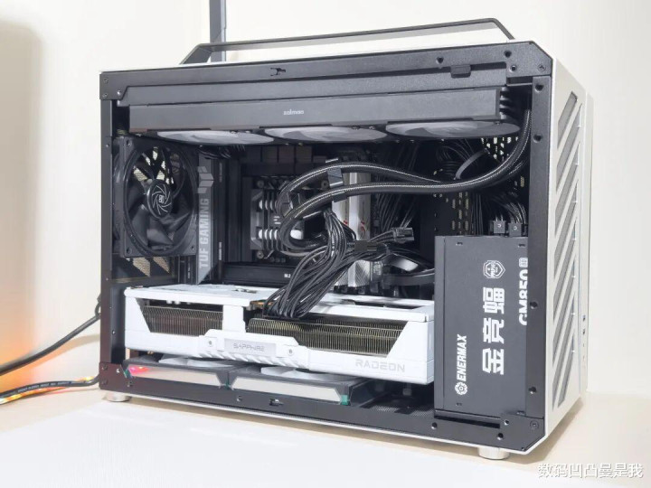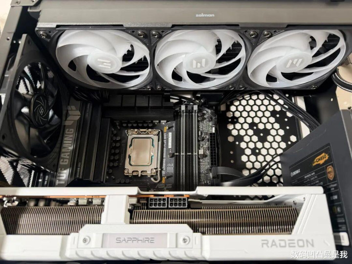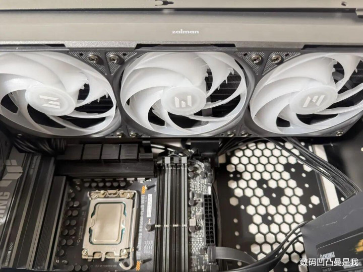 装上ZALMAN想民ALPHA2 SE A36 360水冷和蓝对峙RX 9070XT极地版,底部还装了两个进风电扇,左侧装了一个出风电扇,右侧的进风电扇莫得装,因为是镂空设想,是以也防碍易积热,如果想再加一个电扇亦然可以的。