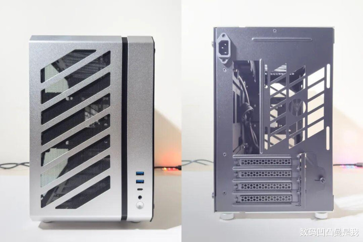 这款机箱机身尺寸为429*205*313mm,体积仅27.5L,比凡俗MATX机箱还要工致不少,是以放在桌面占用的空间面积会更少,同期也配了铝合金提手,偶尔需要移动主机时,单手就能拎着走。