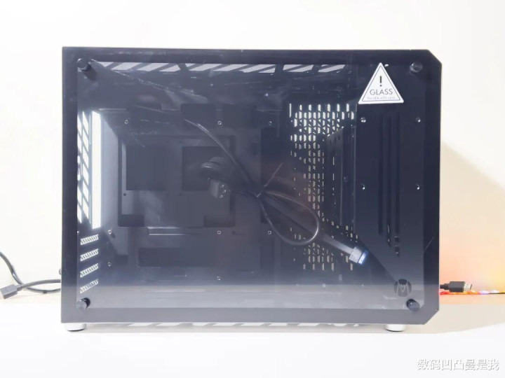 机身侧面配的是高透钢化玻璃,可以领路看到里面硬件布局,适应可爱展示硬件灯光的玩家。除了ATX主板外,MATX、MATX背插版和ITX三种版型齐能装上,跟我手头这款低廉工致的TUF迫击炮还挺搭的。