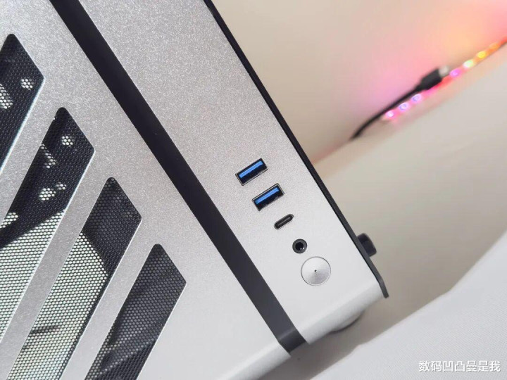 机身也配备了多个前置接口,除了2个USB3.0(5Gbps),还有1个Type-C(10Gbps)和1个二合一音频接口,正常使用键鼠可插主板接口或用蓝牙,机身前置接口插U盘、耳机之类的齐够用了,速率也有保险。