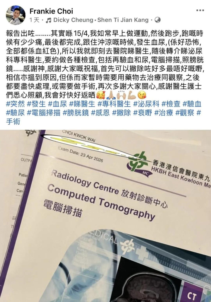 经过多项查验之后,蔡国威在昨日(4 月 26 日)公开了最新体格现象,查验解释也曾甩掉了多项严重病症。