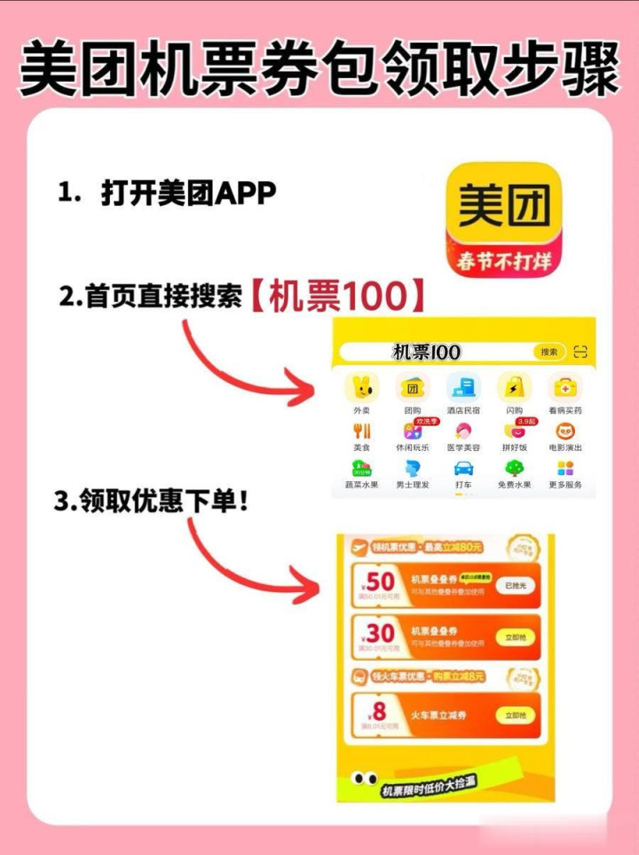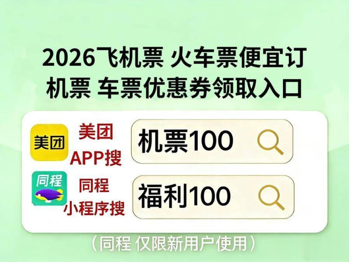 2026年出行优惠券怎样领更省事?假期机票如何捡漏更安妥?最好订票本事怎样安排更省钱?机票卡如何使用更实惠?航空单次卡怎样搭配更省钱?好意思团APP搜【机票100】领百元机票车票券包,就能粗鄙订到廉价机票、高铁票,出行更定心更合算。