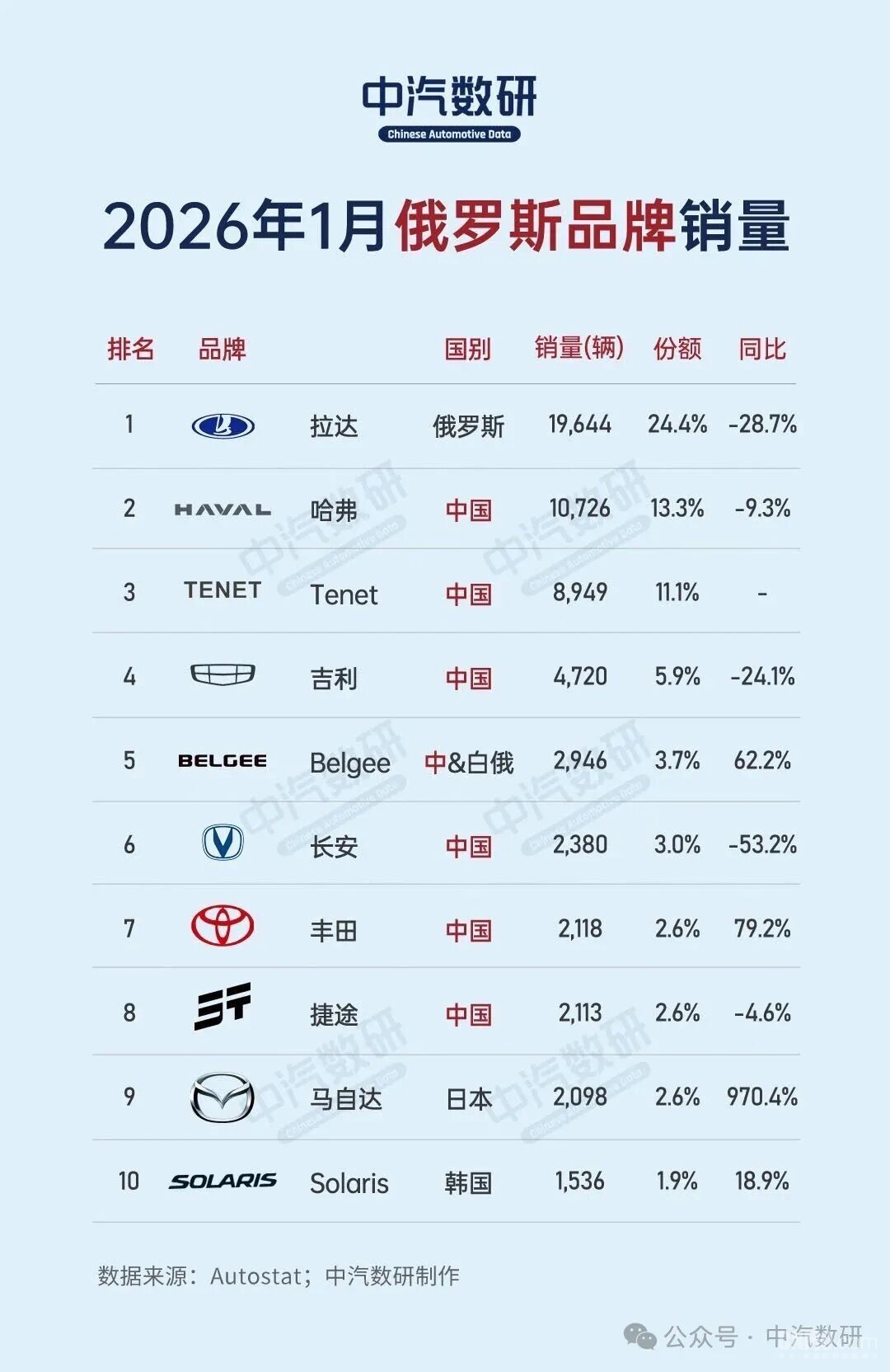 【CNMO科技音书】2月6日,中汽数研发布了2026年1月俄罗斯品牌/车型销量。CNMO防卫到,2026年1月俄罗斯新车注册量为80604辆,同比下滑9.5%,环比暴跌近41%。中国品牌中,哈弗的销量最高。