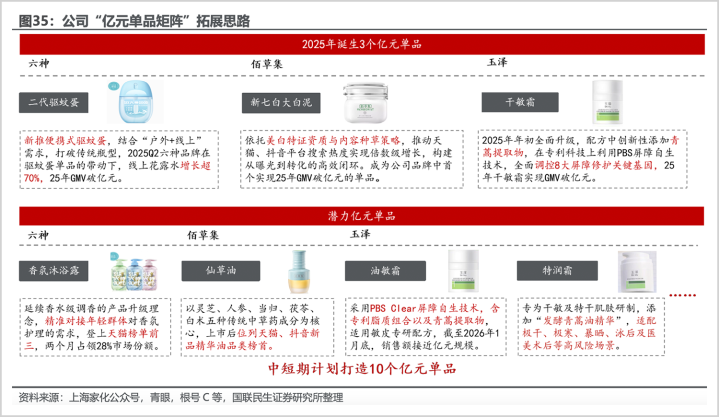 除仍是跑出来了的三大亿元单品外,上海家化亦有多个新品展现出冲击亿元单品的势能。六神通晓香氛沐浴露、玉泽油敏霜(第二代)、玉泽特润霜、佰草集仙草油等齐将成为“亿元单品”的后劲选手,印证公司大单品策略的可复制性以及日益锻练的爆品孵化能力。